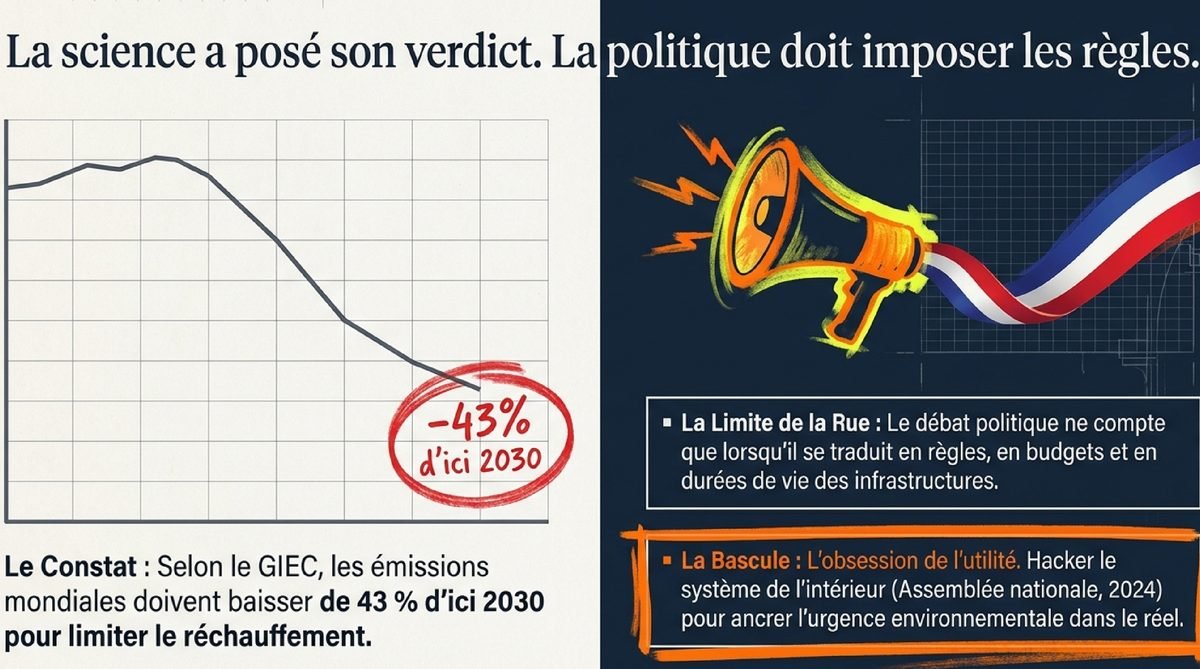 La nuance d’Alice — Le passage d’un engagement climat de la rue à l’Assemblée change surtout l’échelle d’action, pas le verdict scientifique : selon le GIEC, les émissions mondiales doivent baisser de 43 % d’ici 2030 pour rester sur une trajectoire 1,5 °C. En réalité, le débat politique compte davantage quand il se traduit en règles, budgets et durée de vie des infrastructures que lorsqu’il se limite à des symboles.