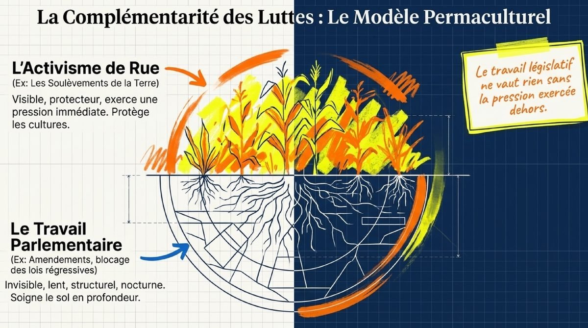 Mais ne t’y trompe pas, son arrivée au palais Bourbon ne signifie pas qu’elle a rangé ses convictions militantes au placard. Au contraire, elle théorise une complémentarité des luttes. Pour elle, son travail législatif (souvent nocturne, entre amendements et budget) ne vaut rien sans la pression exercée dehors par des mouvements comme Les Soulèvements de la Terre. C’est un peu comme en agriculture durable : il faut soigner le sol en profondeur tout en protégeant les cultures, un principe que l’on retrouve dans les principes de la permaculture et du durable appliqués à la politique.