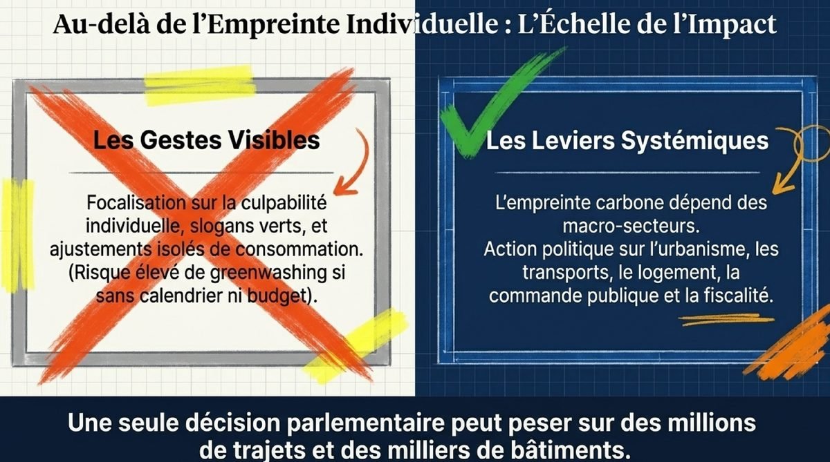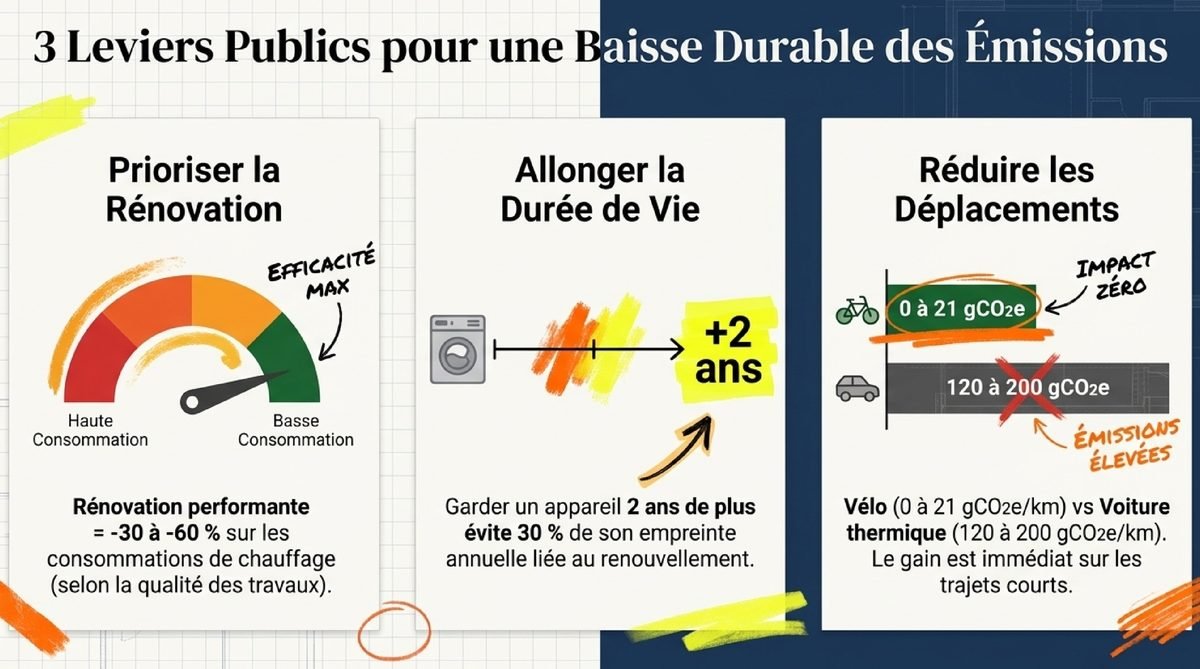 Les leviers individuels restent utiles, mais l’essentiel se joue à l’échelle des politiques publiques : urbanisme, transports, logement, commande publique, fiscalité. Une décision parlementaire peut peser sur des millions de trajets, des milliers de bâtiments ou des chaînes d’approvisionnement entières, bien plus qu’un ajustement isolé de consommation. À vérifier avant d’y croire : une promesse « verte » sans calendrier, sans budget et sans indicateur de suivi relève souvent du greenwashing. Pour un repère sur la rénovation énergétique et ses ordres de grandeur, une source d’autorité reste utile : ADEME.