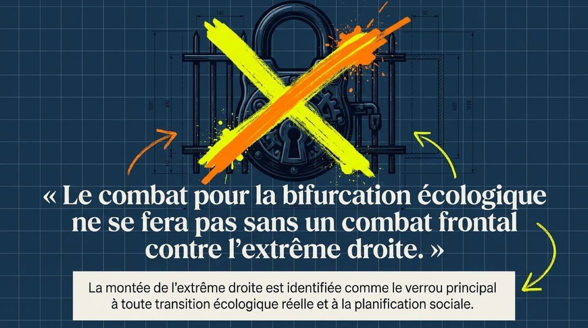 • La lutte antifasciste : Considérer que la montée de l’extrême droite est le verrou principal à toute transition écologique réelle.