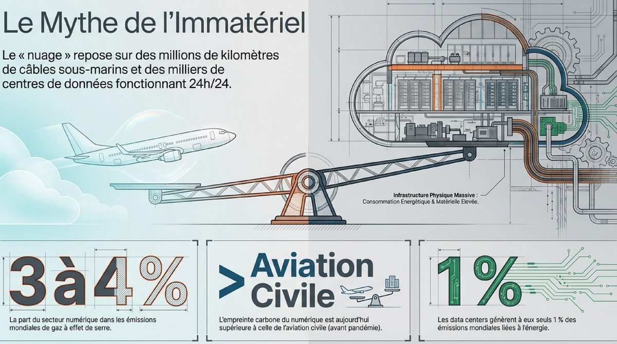 Le terme « cloud computing » ou informatique en nuage évoque souvent une image immatérielle, presque magique, où les données flottent librement. La réalité physique est tout autre. En 2025, le cloud repose sur des millions de kilomètres de câbles sous-marins et, surtout, sur des milliers de centres de données (data centers) répartis sur le globe. Ces cathédrales du numérique fonctionnent 24 heures sur 24, 7 jours sur 7, pour assurer la disponibilité de nos services. Selon les analyses du Shift Project et de l’Agence internationale de l’énergie, le secteur numérique représente désormais entre 3 et 4 % des émissions mondiales de gaz à effet de serre. Pour mettre ce chiffre en perspective, c’est une empreinte supérieure à celle de l’aviation civile avant la pandémie.
