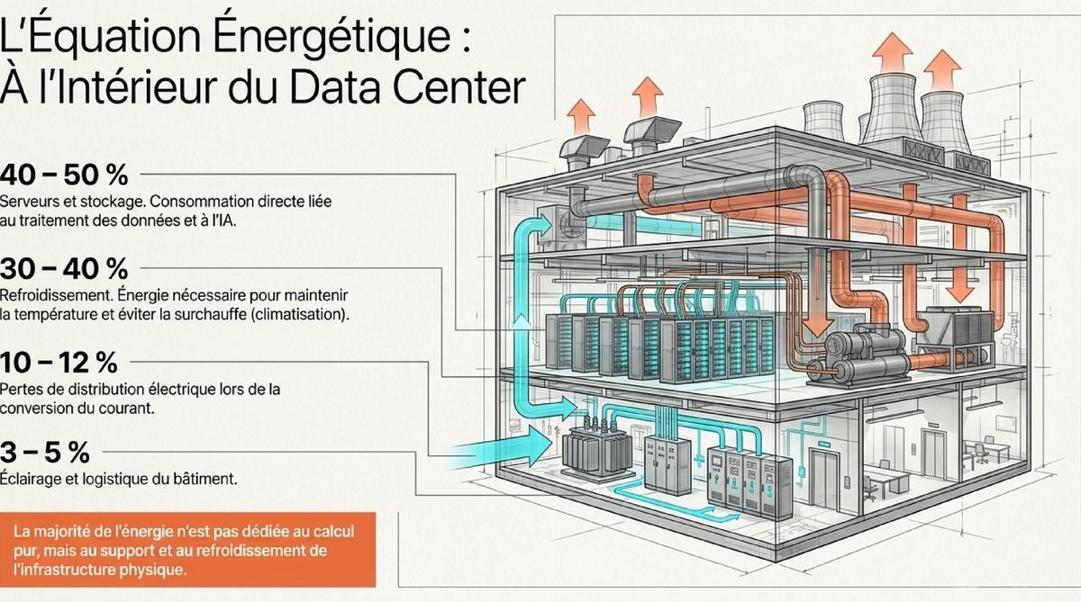 | ❄️ Refroidissement (Climatisation) | 30 – 40 % | Énergie nécessaire pour maintenir les équipements à température optimale et éviter la surchauffe. |