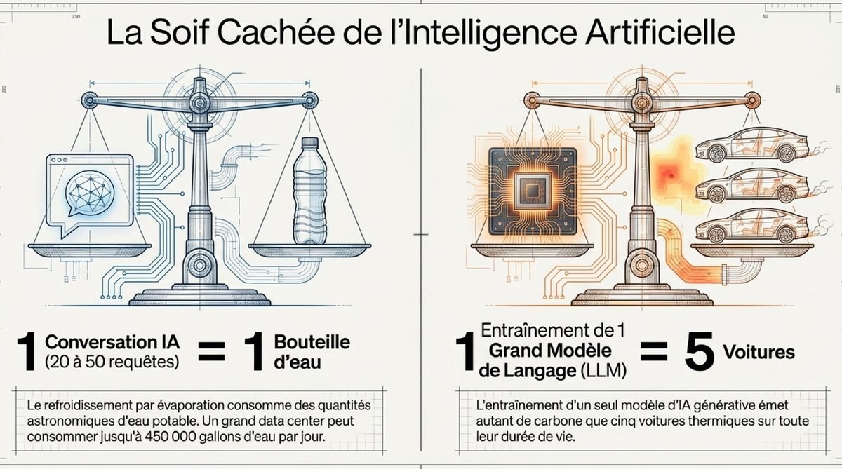 - 💧 Soif de ressources : Les data centers consomment des quantités astronomiques d’eau potable pour le refroidissement, posant des conflits d’usage locaux.