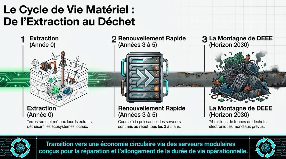 Au-delà de l’eau et de l’électricité, la matérialité du cloud s’exprime par une production massive de déchets. La course à la puissance de calcul pousse au renouvellement fréquent du matériel. Les serveurs sont souvent remplacés tous les trois à cinq ans, générant des montagnes de déchets d’équipements électriques et électroniques (DEEE). En 2022, le monde a produit près de 60 millions de tonnes de ces déchets, un chiffre en constante augmentation. Seule une infime partie est correctement recyclée, le reste finissant souvent dans des décharges à ciel ouvert, polluant les sols et les nappes phréatiques avec des métaux lourds.