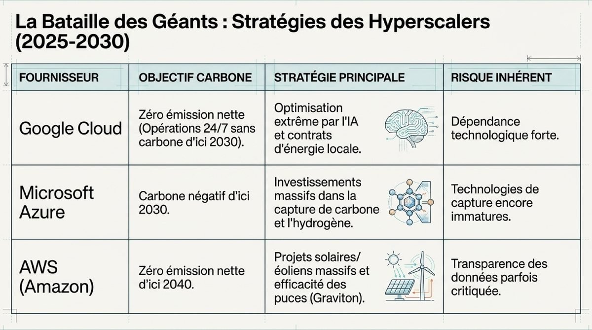 | AWS (Amazon) | Zéro émission nette d’ici 2040 | Projets solaires/éoliens massifs et efficacité des puces (Graviton). | Transparence des données parfois critiquée. |