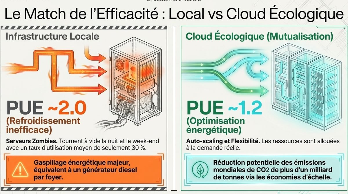 *Calcul basé sur un mix énergétique moyen de 0.3kg CO2/kWh. PUE Local: 2.0 vs PUE Cloud: 1.2. Le cloud permet d’ajuster les ressources à la demande réelle (auto-scaling), réduisant le gaspillage d’énergie inactive.