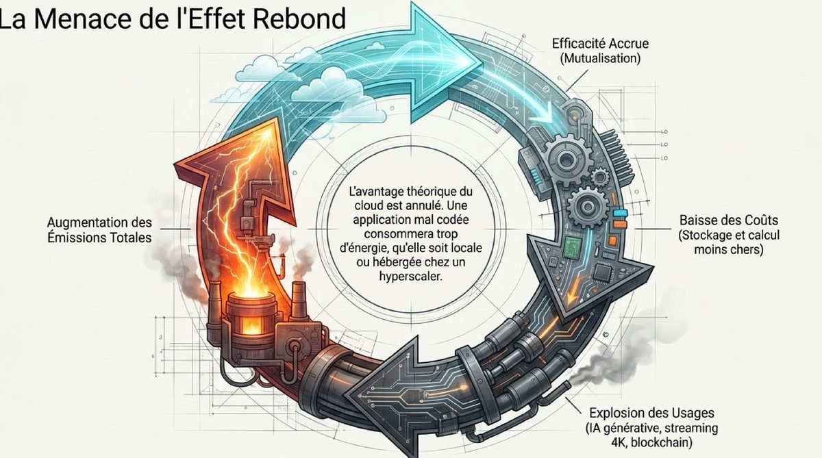 Des études suggèrent que la migration vers le cloud pourrait réduire les émissions de CO2 de plus d’un milliard de tonnes à l’échelle mondiale grâce à cette meilleure efficacité énergétique. Les hyperscalers construisent des infrastructures optimisées que peu d’entreprises peuvent s’offrir : architectures bioclimatiques, récupération de chaleur, matériel de pointe. Cependant, cet avantage théorique est menacé par l’effet rebond : comme le stockage et la puissance de calcul deviennent moins chers et plus accessibles via le cloud, nous avons tendance à en consommer beaucoup plus, annulant potentiellement les gains d’efficacité unitaires.