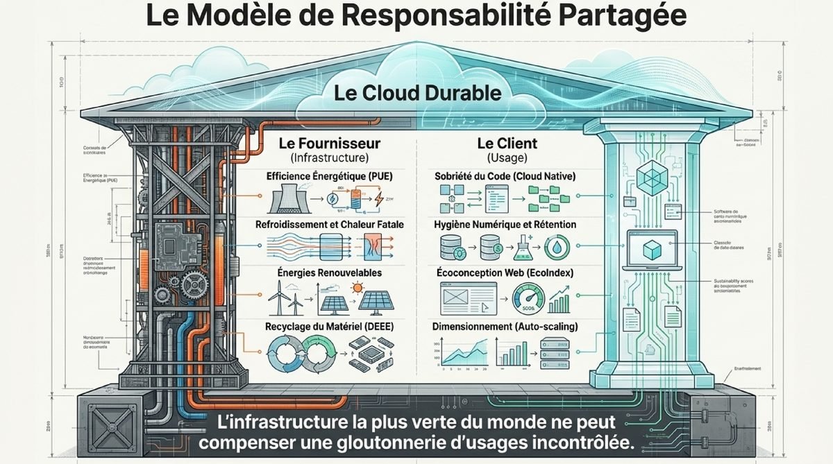 Il ne suffit pas de migrer vers le cloud pour être "vert". Il faut adopter une approche "Cloud Native" qui optimise le code et les ressources. Une application mal codée consommera trop d'énergie, qu'elle soit hébergée localement ou chez Amazon. L'utilisateur a donc une responsabilité majeure dans la configuration de ses services. C'est ce qu'on appelle le modèle de responsabilité partagée : le fournisseur assure l'efficience de l'infrastructure, le client assure la sobriété de son usage.