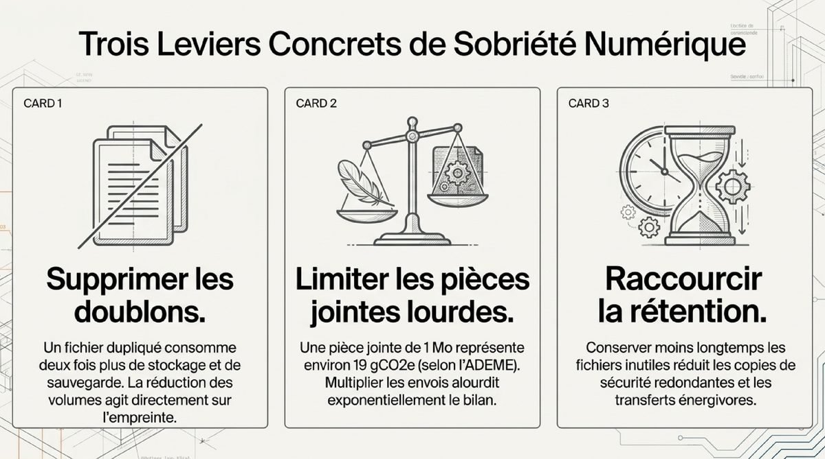 - Supprimer les doublons — Un fichier dupliqué consomme une seconde fois stockage et sauvegarde ; selon l’ADEME, la réduction des volumes stockés agit directement sur l’empreinte des usages.