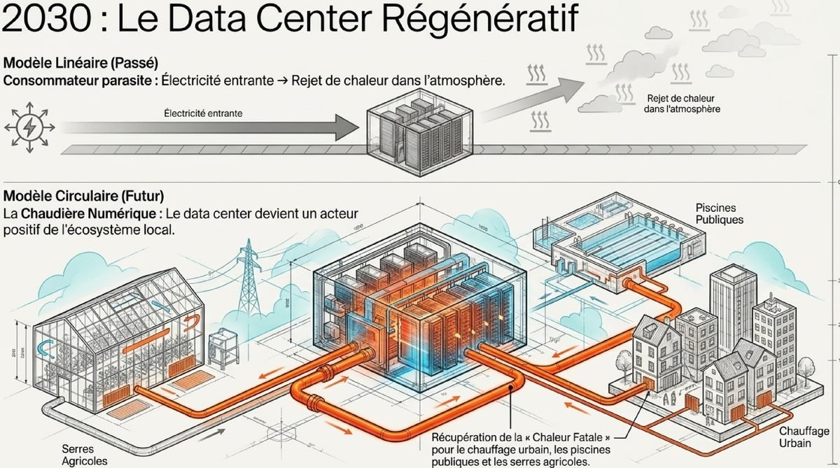 À quoi ressemblera le cloud de demain ? Si l'on se projette vers 2030, l'informatique durable ne sera plus une option mais une norme dictée par la survie climatique et la législation. L'une des pistes les plus prometteuses est la transformation des data centers en acteurs positifs de leur écosystème local. Au lieu de rejeter la chaleur fatale dans l'air, celle-ci sera systématiquement captée pour chauffer des réseaux urbains, des piscines ou des serres agricoles adjacentes. Le centre de données ne sera plus un consommateur parasite, mais une chaudière numérique au service de la communauté.