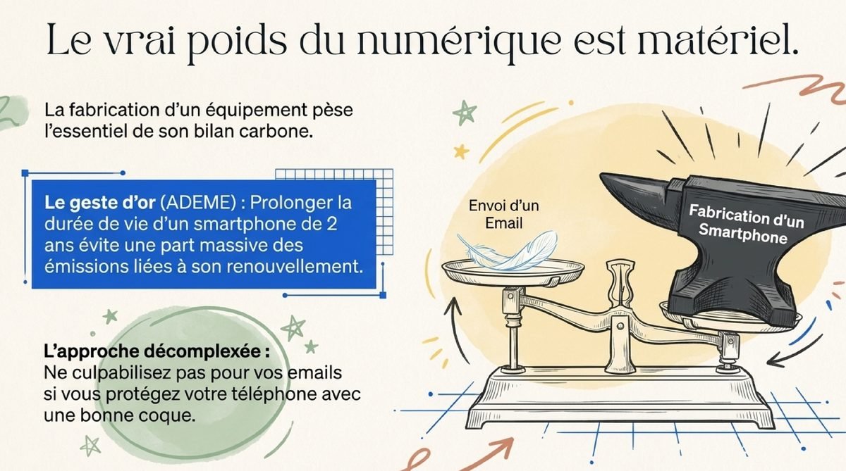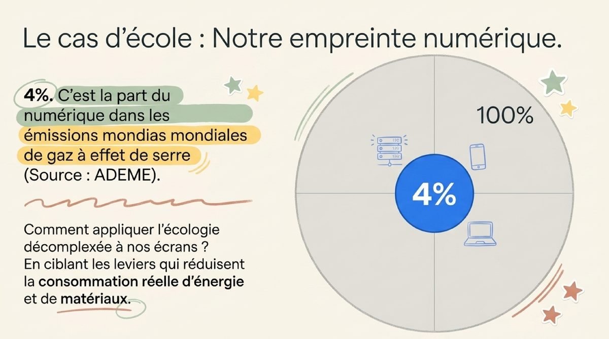 La nuance d’Alice — L’écologie « sans pression » n’est pas qu’une question de posture : les ordres de grandeur comptent. Selon l’ADEME, le numérique représente environ 4 % des émissions mondiales de gaz à effet de serre ; dans les faits, les gains les plus nets se jouent surtout sur la durée de vie des appareils et la sobriété des usages.