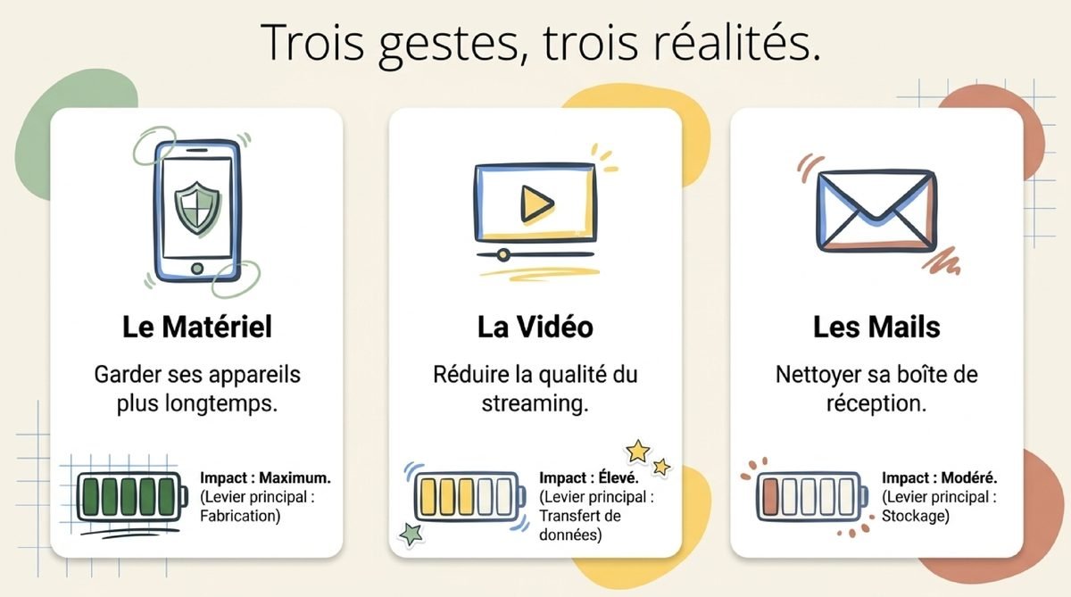 Découvrir une écologie décomplexée commence souvent par des gestes lisibles, mesurables et adaptés au quotidien. Dans les faits, l’empreinte carbone ne se réduit pas avec une perfection abstraite, mais avec des arbitrages concrets : prolonger la durée de vie du matériel, alléger certains usages numériques et éviter les achats ou services dont l’impact est faible à l’échelle individuelle. Selon l’ADEME et le Shift Project, les leviers les plus efficaces restent ceux qui réduisent la consommation réelle.