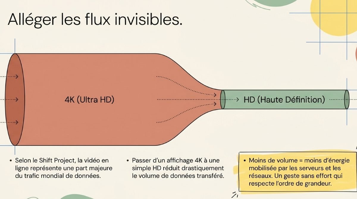 • Réduire le streaming en haute définition — Le Shift Project estime que la vidéo en ligne représente une part majeure des flux de données : passer de la 4K à la HD réduit fortement le volume transféré, donc l’énergie mobilisée.