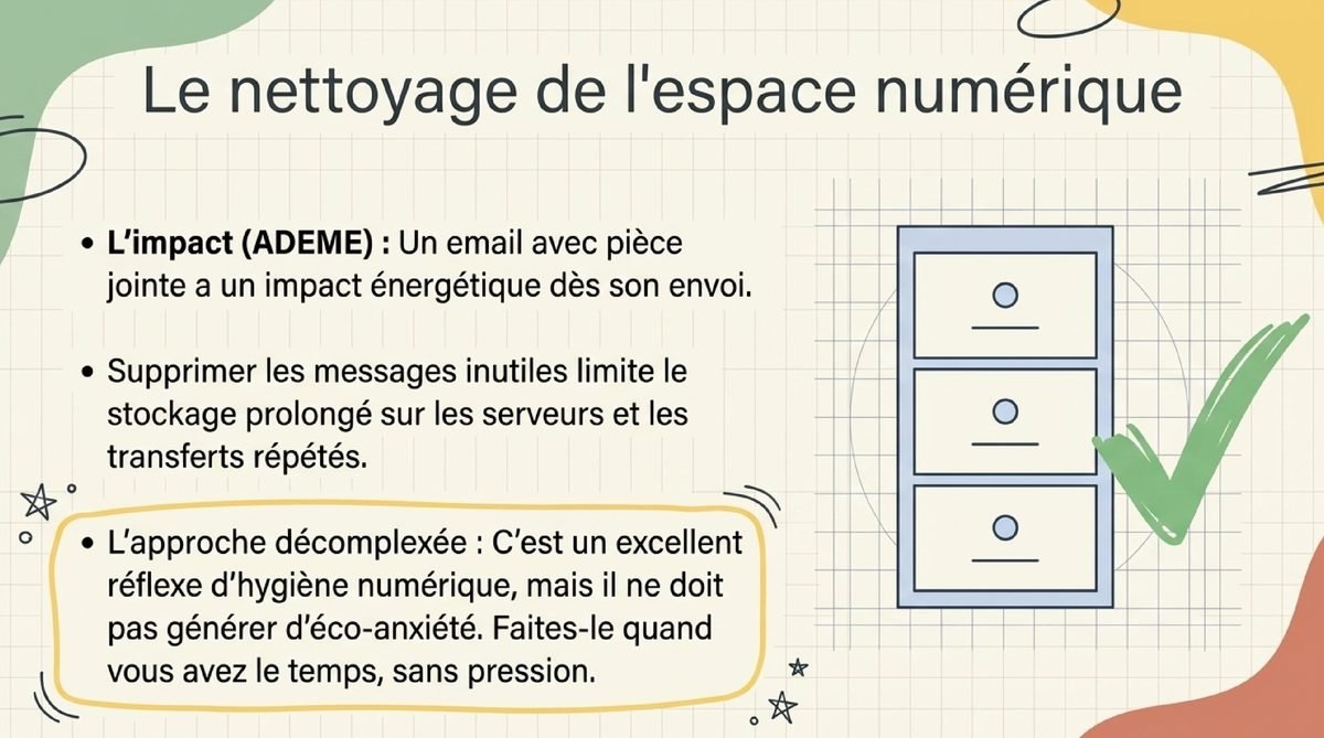• Nettoyer ses mails et pièces jointes — L’ADEME indique qu’un email avec pièce jointe a un impact non nul dès l’envoi ; supprimer les messages inutiles limite le stockage et les transferts répétés.