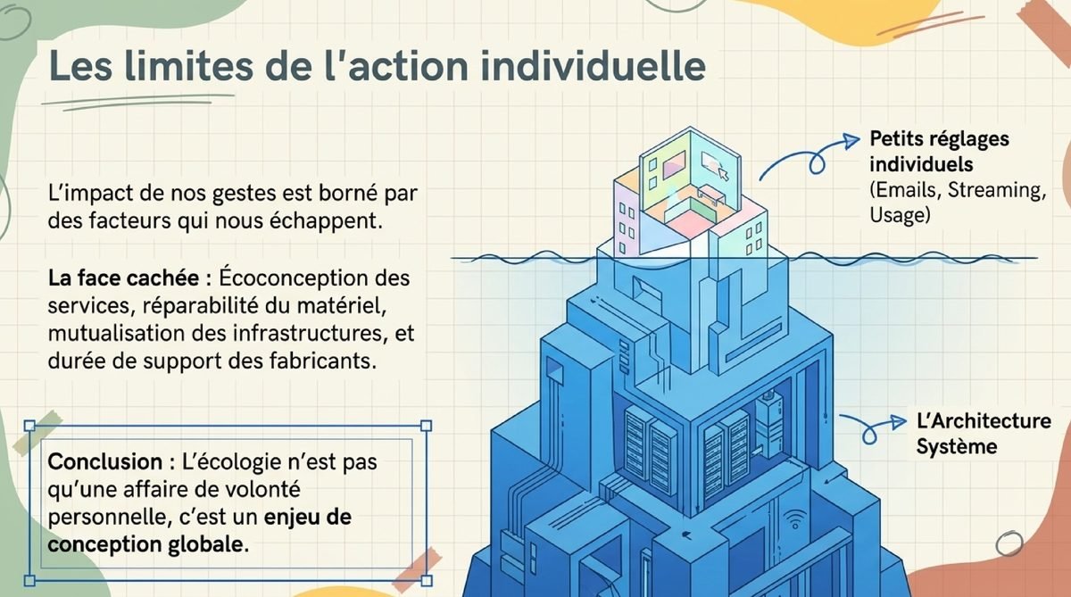 Ces gestes ont un intérêt réel, mais leur portée reste bornée par les choix de conception des services, la durée de support des fabricants et l’architecture des plateformes. En réalité, l’impact se joue surtout côté écoconception, réparabilité, mutualisation des infrastructures et allongement de la durée d’usage, pas seulement côté petits réglages individuels. Un lien utile pour aller plus loin sur les ordres de grandeur : ADEME. Dans cette logique, la sobriété numérique n’est pas une injonction morale ; c’est une méthode pour concentrer l’effort là où il produit le plus d’effet mesurable.