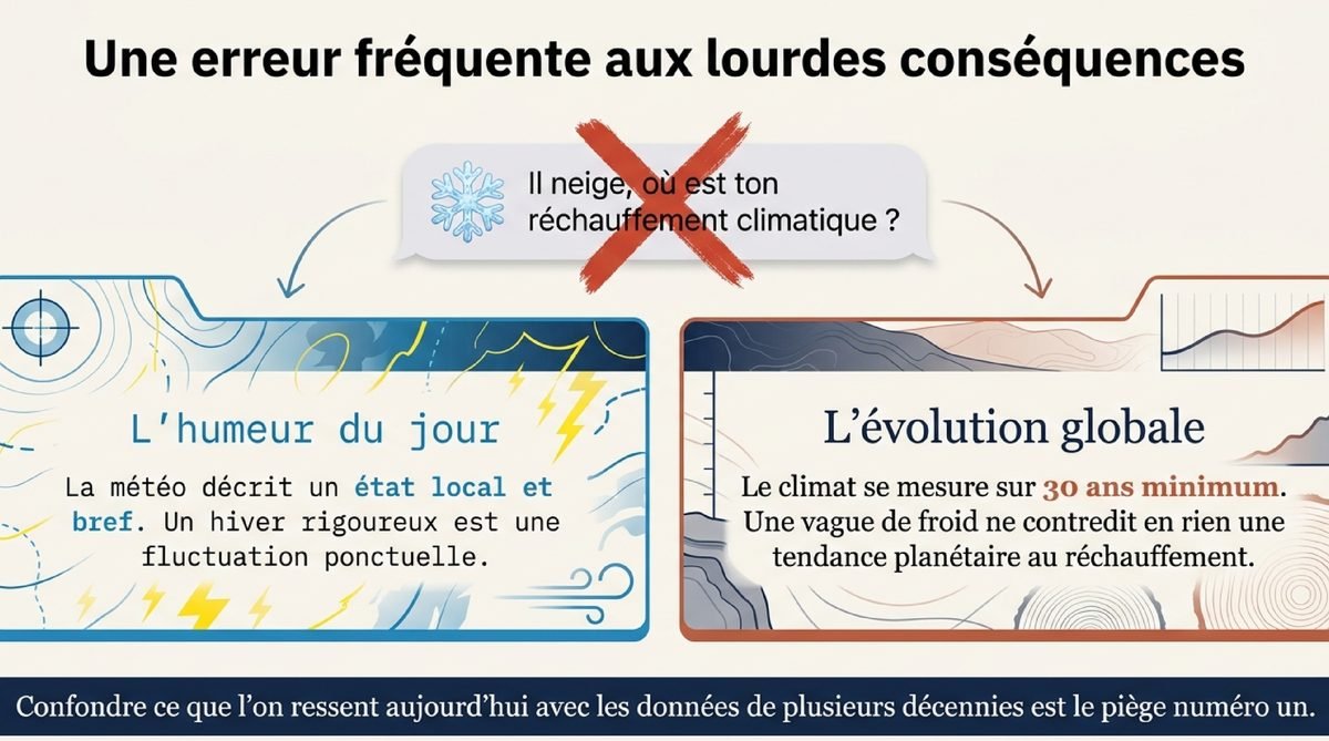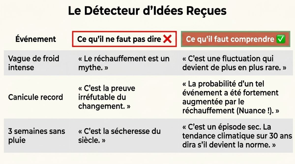 - 💡 Réalité scientifique : La météo locale fluctue, le climat global se réchauffe. C’est la différence entre une vague et la marée.