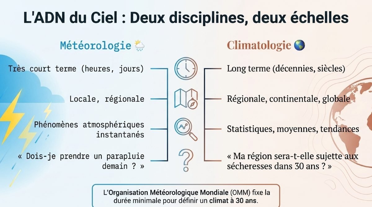 | Critère | Météorologie 🌦️ | Climatologie 🌍 |