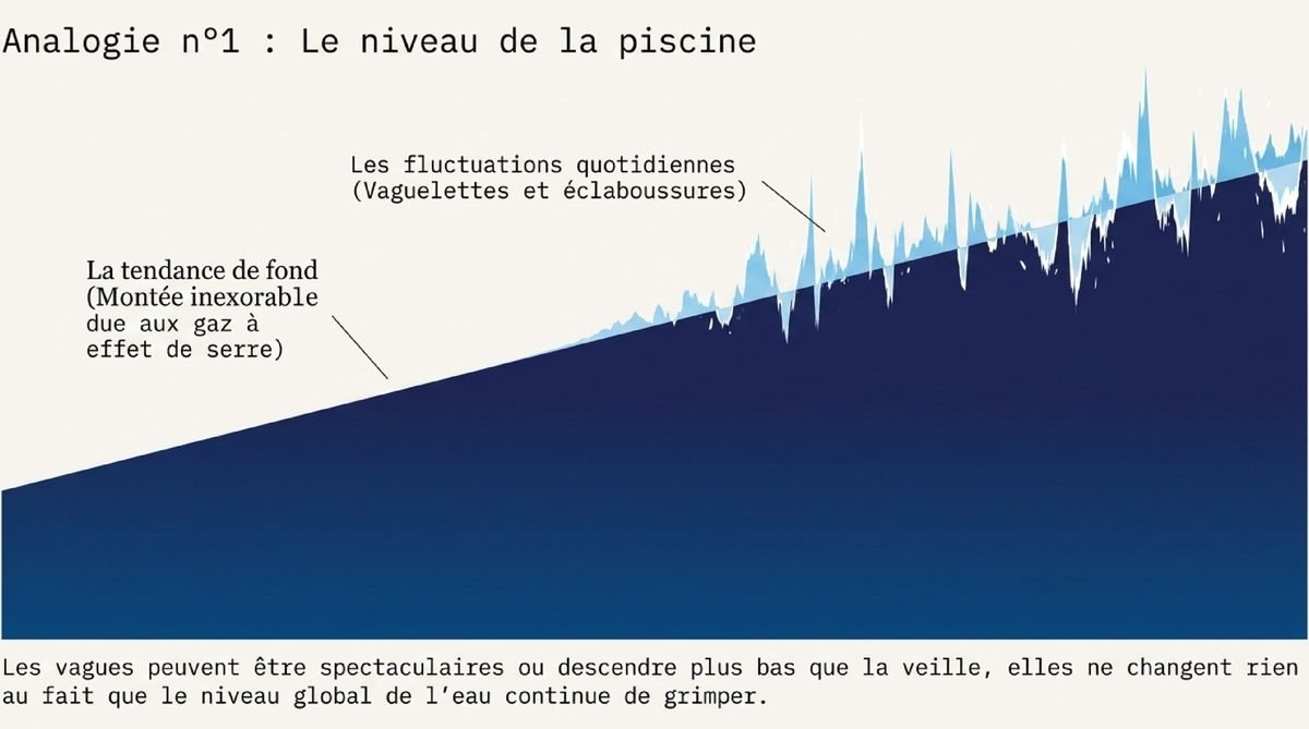 Pour vraiment saisir la nuance, rien de tel que des analogies parlantes. La climatologue Valérie Masson-Delmotte en propose une excellente : celle de la piscine. Imagine une piscine dont les robinets sont grands ouverts. Le niveau de l’eau monte lentement mais sûrement : ça, c’est le changement climatique. Maintenant, si quelqu’un plonge dans la piscine, il crée des vagues et des éclaboussures : ça, c’est la météo. Les vaguelettes sont les fluctuations quotidiennes, parfois spectaculaires, mais elles ne changent rien à la tendance de fond, qui est la montée inexorable du niveau de l’eau. Même si une vague est plus basse que la précédente, le niveau général, lui, continue de grimper tant que les robinets (nos émissions de gaz à effet de serre) restent ouverts.
