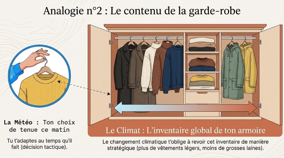 - 👕 Analogie de la Garde-robe : La météo guide ton choix de tenue du jour, le climat définit le contenu de ton dressing.
