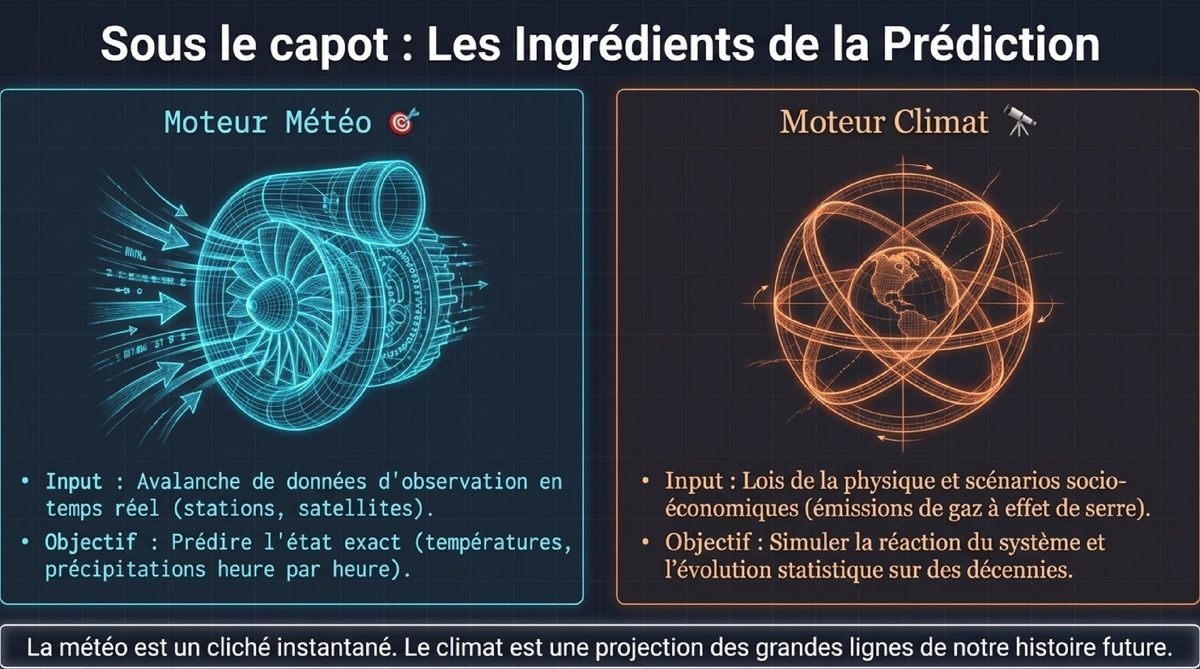 | Élément | Modèle Météo (Prévision) 🎯 | Modèle Climatique (Projection) 🔭 |