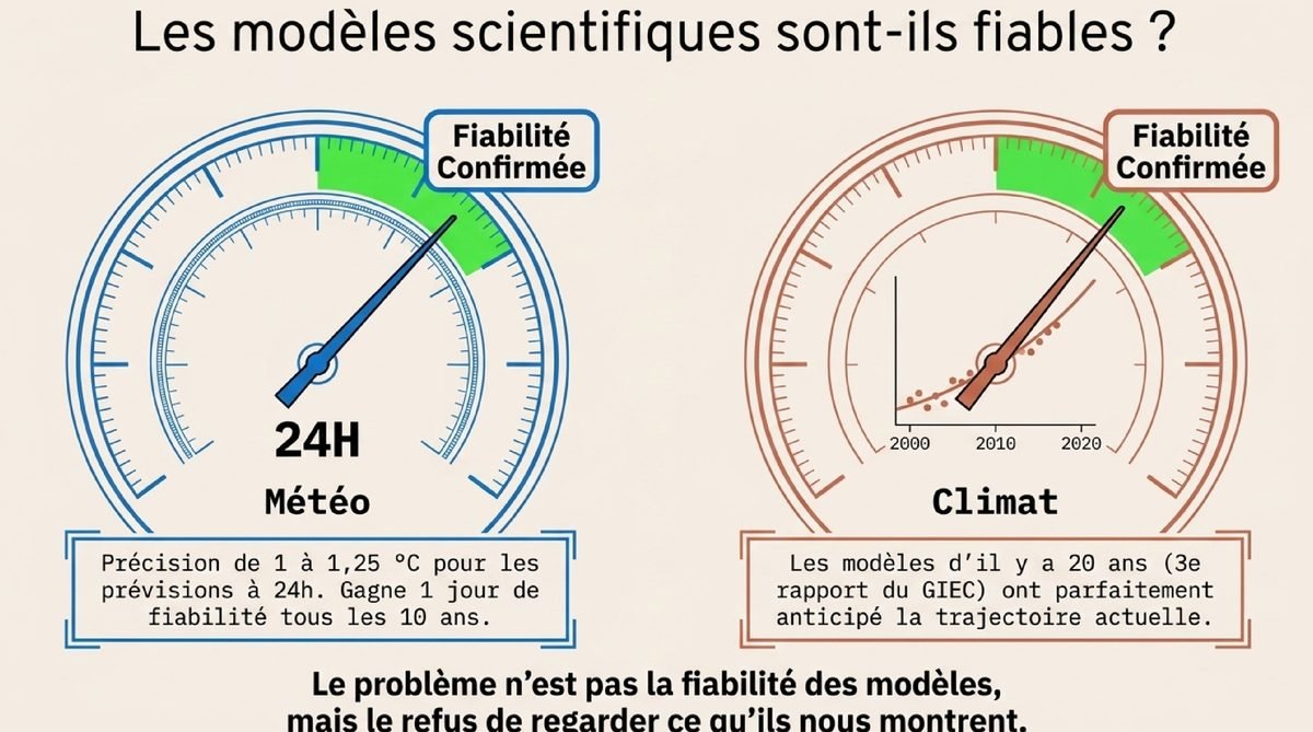 Une autre attaque fréquente contre la science du climat consiste à discréditer la fiabilité de ses modèles, souvent en faisant un parallèle trompeur avec la météo. « Les météorologues se trompent souvent pour demain, comment peut-on croire des prévisions pour 2100 ? », entend-on parfois. Cette idée reçue repose, encore une fois, sur une confusion entre les deux disciplines. Tout d’abord, la qualité des prévisions météo s’est considérablement améliorée. Les études de Météo-France montrent que la prévision du type de temps à 24 heures est juste dans la très grande majorité des cas, avec une précision sur la température de l’ordre de 1 à 1,25 °C. Mieux encore, la performance des modèles gagne environ un jour de fiabilité tous les dix ans. La prévision à 7 jours aujourd’hui est aussi fiable que celle à 6 jours il y a une décennie.
