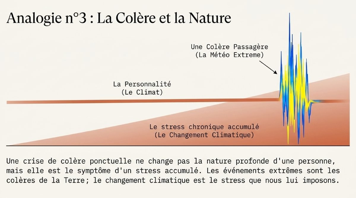 Si les analogies de la piscine et de la garde-robe ne t’ont pas suffi, en voici une dernière : imagine une personne de nature très calme. C’est son « climat » personnel. Pendant 30 ans, tout le monde la décrit comme quelqu’un de posé. Puis, un jour, suite à une accumulation de stress, elle s’énerve violemment pendant 72 heures. C’est sa « météo » du moment. Cette colère passagère ne change pas sa nature profonde, mais elle est peut-être le symptôme d’un stress de fond qui s’accumule. C’est la même chose pour notre planète. Les événements extrêmes sont les colères de la Terre, et le changement climatique est le stress chronique que nous lui imposons. Comprendre cette différence est essentiel, car comme le souligne l’Accord de Paris, l’éducation est notre meilleur outil pour agir. Il est urgent que chacun, citoyens comme décideurs, prenne la mesure du changement de fond qui s’opère derrière les fluctuations quotidiennes du temps.