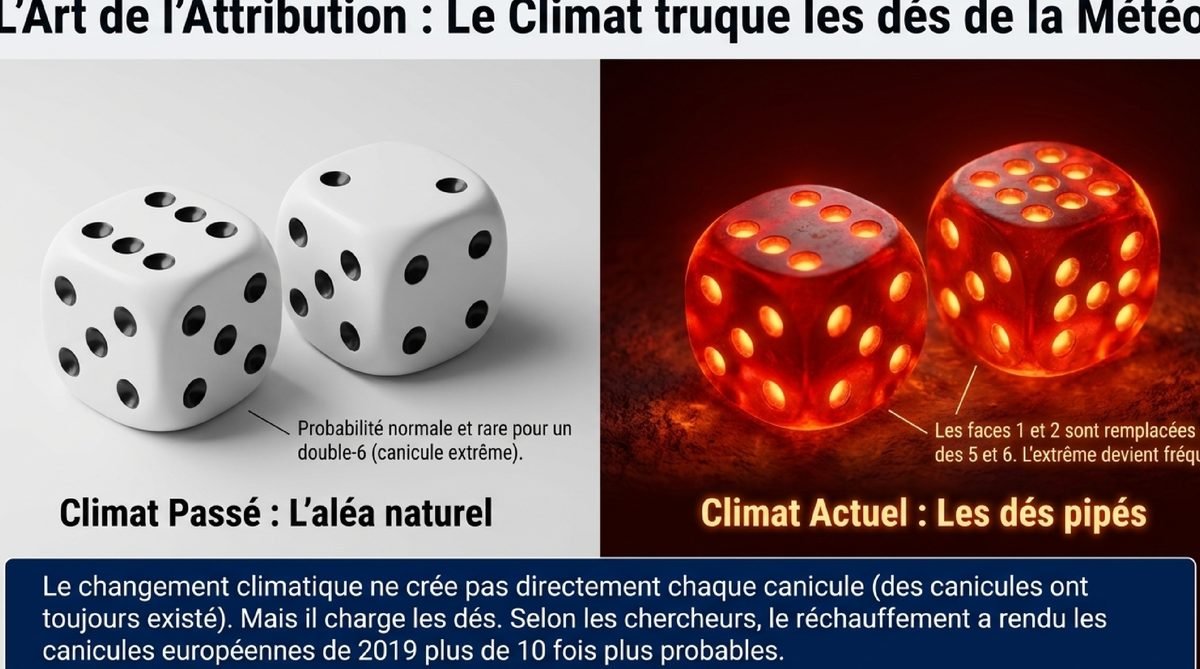 Il faut toutefois rester précis. Comme le rappelle le chercheur Samuel Morin, on ne peut pas affirmer qu’une canicule donnée est directement causée par le changement climatique. Des canicules ont toujours existé. En revanche, la science de l’attribution permet aujourd’hui de calculer à quel point le changement climatique a rendu cet événement plus probable ou plus intense. Par exemple, les scientifiques ont estimé que le réchauffement a rendu les canicules de 2019 en Europe plus de dix fois plus probables. Le changement climatique charge les dés : il rend les événements chauds extrêmes beaucoup plus fréquents, et les événements froids extrêmes beaucoup plus rares. Pour d’autres phénomènes comme les tempêtes ou les inondations, le lien est encore à l’étude et moins direct, même s’il est probable que leur fréquence soit aussi affectée.