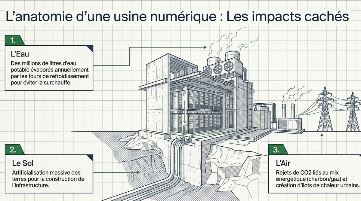 | Sol 🚜 | Artificialisation des terres pour construire les centres | Réhabilitation de friches industrielles, bâtiments verticaux |