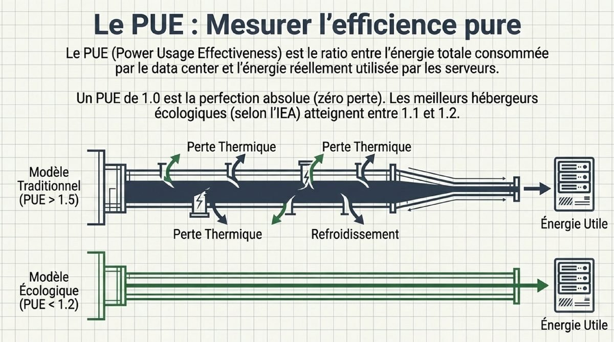 - Le PUE (Power Usage Effectiveness) : C’est le ratio entre l’énergie totale consommée par le data center et l’énergie réellement utilisée par les équipements informatiques. Un PUE de 1.0 est idéal (aucune perte). Les hébergeurs écologiques visent un PUE inférieur à 1.2.