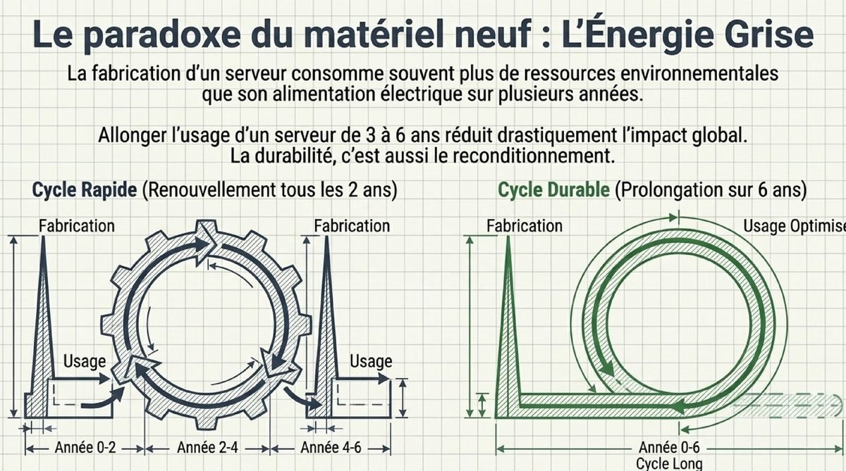 Il est également essentiel de comprendre que la notion de « vert » englobe la gestion du cycle de vie du matériel. Les serveurs verts ne sont pas nécessairement des machines neuves ; au contraire, prolonger la durée de vie d’un serveur de 3 à 5 ou 6 ans permet d’amortir l’énergie grise nécessaire à sa fabrication. C’est un aspect souvent négligé : la fabrication d’un ordinateur consomme beaucoup plus de ressources que son utilisation électrique sur plusieurs années.