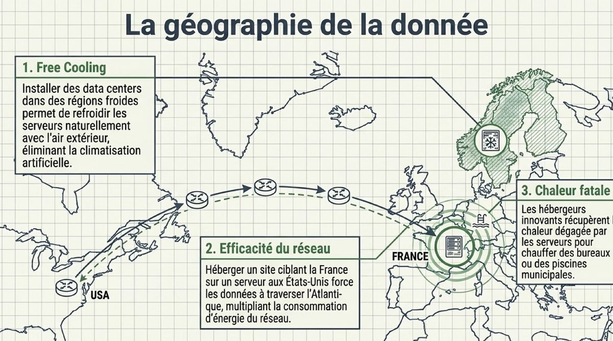 De plus, l’emplacement géographique du centre de données joue un rôle crucial. Si vos visiteurs sont majoritairement en France, héberger votre site aux États-Unis oblige les données à traverser l’Atlantique via des câbles sous-marins et de multiples routeurs, augmentant la consommation énergétique liée au transport de l’information. C’est ce qu’on appelle l’efficacité du réseau : rapprocher les données des utilisateurs finaux est une stratégie clé des data centers écologiques.
