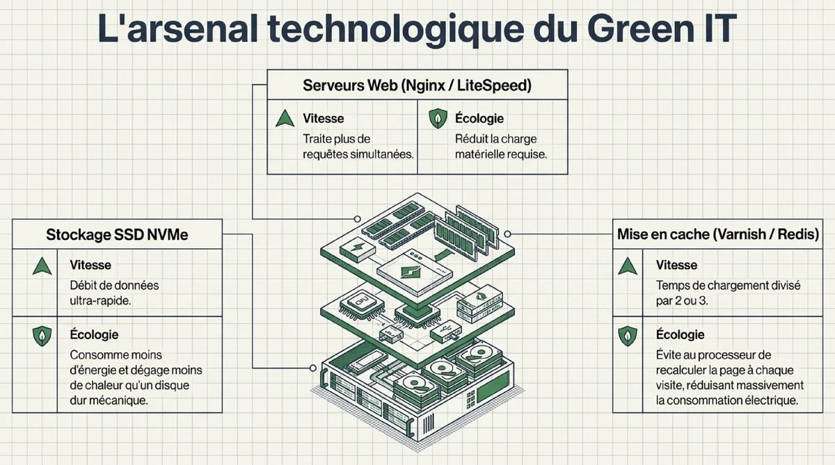 L’activation de systèmes de cache côté serveur (comme Varnish ou Redis) est une pratique courante chez les hébergeurs verts. En stockant une version statique de vos pages, le serveur n’a pas besoin de régénérer le contenu à chaque visite. Cela réduit drastiquement la charge sur le processeur, et donc la consommation électrique, tout en affichant votre site à la vitesse de l’éclair pour l’internaute. Pour approfondir le lien entre vitesse et écologie, consultez ce guide sur l’efficience numérique.