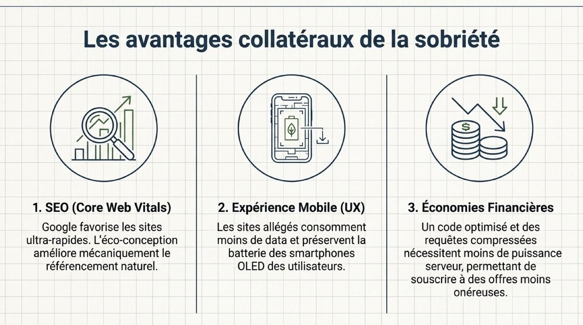 - 🔍 Meilleur référencement (SEO) : Google favorise les sites rapides (Core Web Vitals), ce qui est souvent le résultat d’une démarche d’éco-conception.
