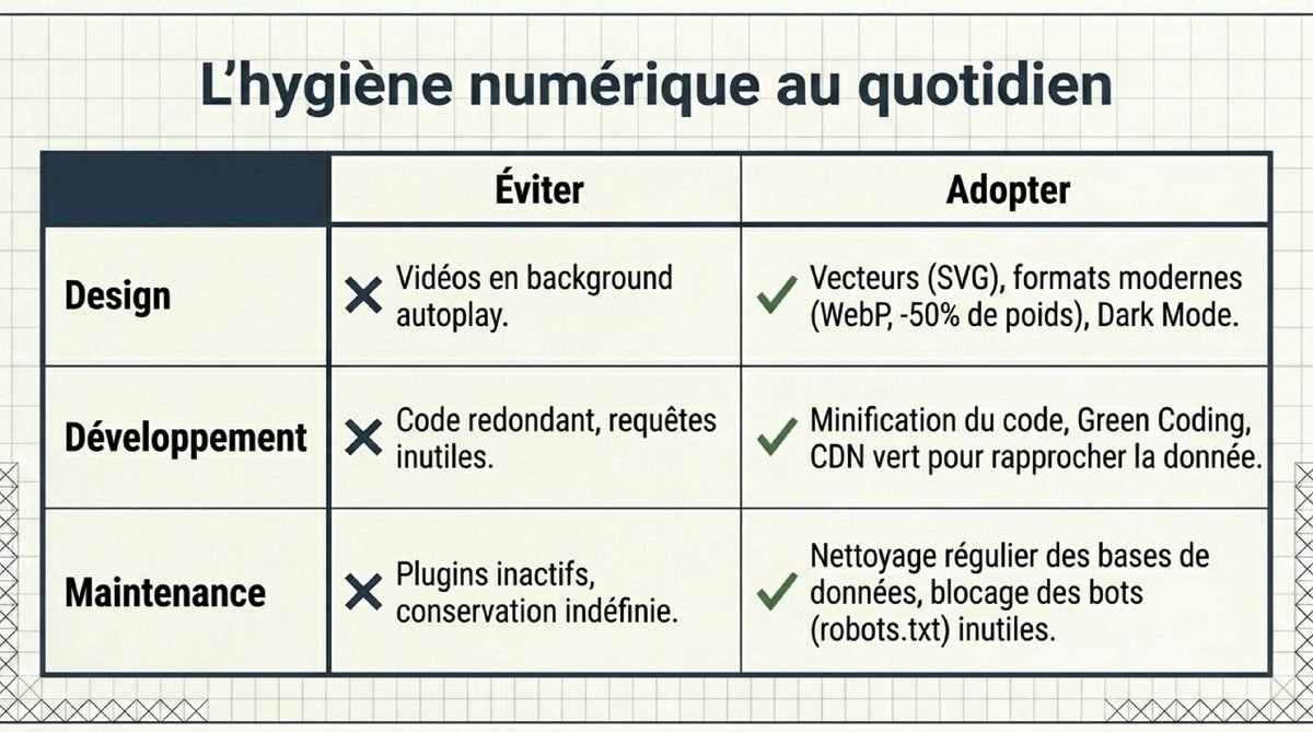 Choisir un hébergeur engagé est une étape fondamentale, mais ce n’est que la première pierre de l’édifice. Pour obtenir un site web réellement à faible impact, il faut adopter une démarche globale de sobriété numérique. Même le serveur le plus vert du monde ne pourra pas compenser un site web mal codé, lourd, rempli de vidéos en lecture automatique et de scripts de suivi publicitaire. L’hébergement web écologique doit s’accompagner d’une « hygiène numérique » rigoureuse de la part du créateur de contenu.