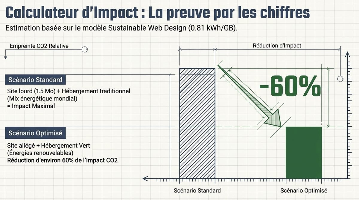 *Estimation basée sur le modèle « Sustainable Web Design ». 0.81 kWh/GB avec une intensité carbone moyenne mondiale vs renouvelable.