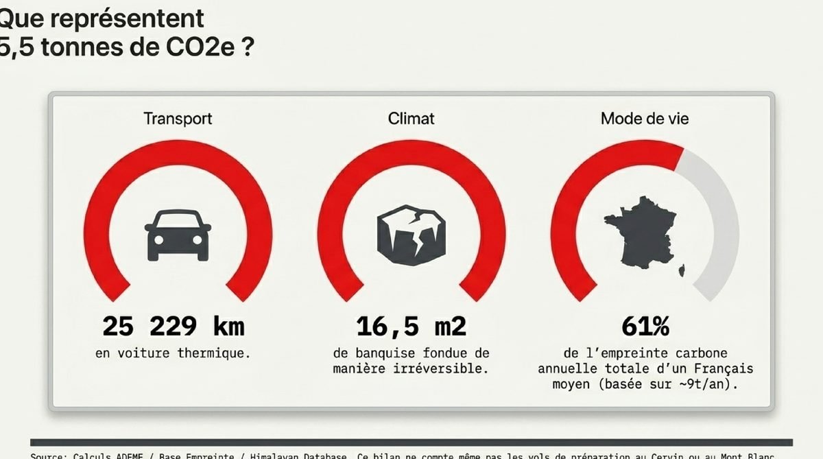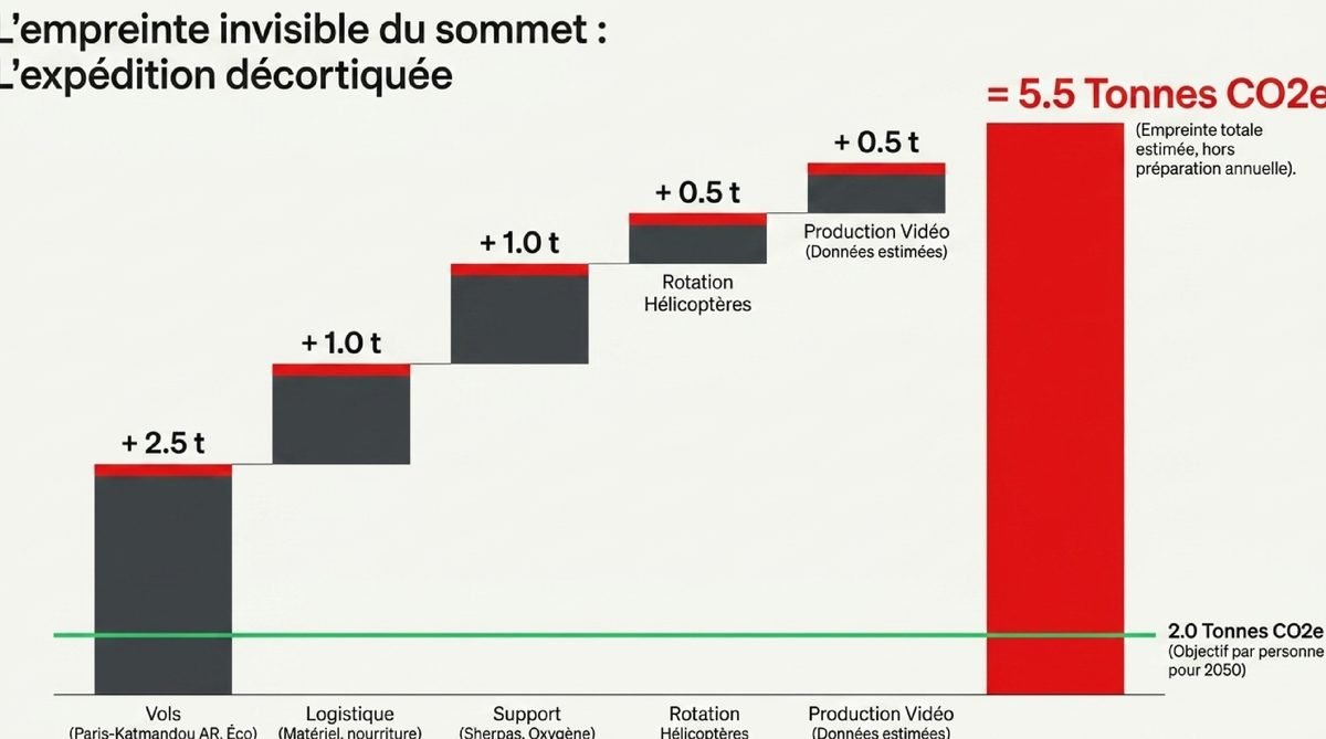 La nuance d’Alice — Le problème n’est pas seulement l’image d’exploit : l’Everest supporte déjà une pression touristique et logistique très élevée, alors que les émissions d’un voyage long-courrier aller-retour vers le Népal se chiffrent en centaines de kilos de CO2 par passager selon l’ADEME. Dans ce type de récit, l’angle mort n’est pas l’effort sportif, mais le coût matériel qu’il laisse hors champ.
