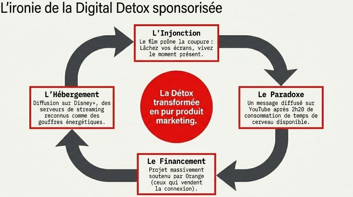 Mais le comble de l’ironie est atteint avec les sponsors. Le documentaire, qui vante les mérites de la nature sauvage et de la coupure avec le monde virtuel, est massivement soutenu par des acteurs du numérique et des télécommunications, notamment Orange. Comment peut-on crédiblement parler de déconnexion quand le projet est financé par ceux qui vendent la connexion ? C’est un cas d’école de récupération marketing. La « détox » devient un produit comme un autre, une posture que l’on adopte le temps d’une vidéo avant de replonger dans le scroll infini.
