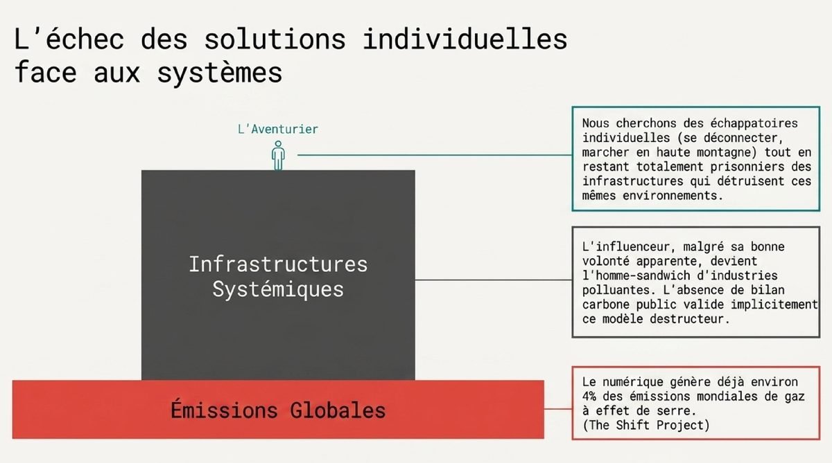 De plus, la diffusion sur Disney+ ajoute une couche au problème. Les plateformes de streaming sont des gouffres énergétiques. En incitant ses abonnés à regarder son film en haute définition sur des serveurs tournant à plein régime, l’empreinte écologique du projet s’alourdit encore. C’est tout le problème de notre époque : nous cherchons des solutions individuelles (se déconnecter, marcher en montagne) à des problèmes systémiques, tout en restant prisonniers des infrastructures qui causent ces problèmes. Inoxtag, malgré sa bonne volonté apparente, reste un homme-sandwich pour les industries qu’il prétend, le temps d’un instant, mettre à distance.