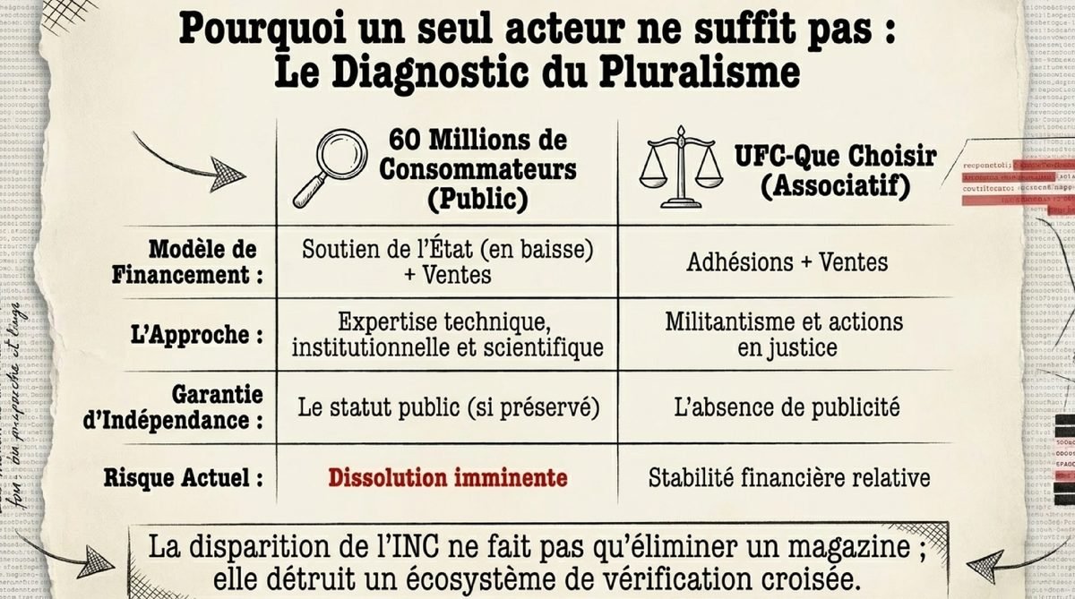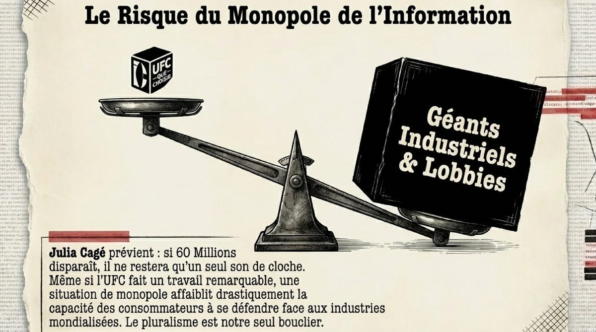 Si 60 Millions de consommateurs disparaît, il ne restera qu’un seul acteur majeur sur le terrain : l’UFC-Que Choisir. Attention, ils font un travail remarquable, et même Julia Cagé le dit : ils sont complémentaires. Mais le pluralisme est vital. Avoir un seul son de cloche, c’est dangereux. Une situation de monopole dans l’information aux consommateurs affaiblit notre capacité à nous défendre face aux géants industriels.